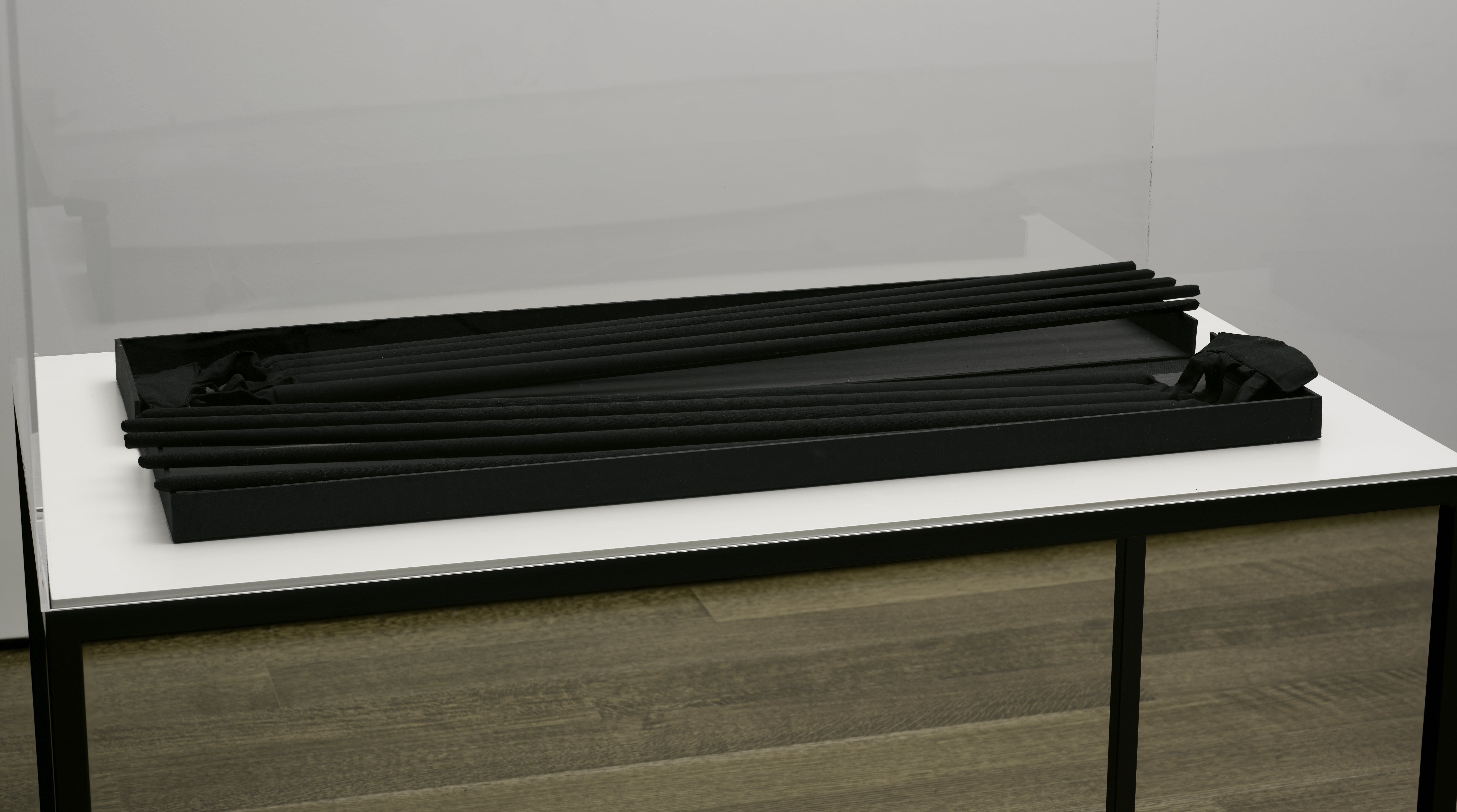Just as she tailored the early body extensions to fit her own measurements and those of her friends and collaborators, the dimensions of the paper support in Rebecca Horn’s large-scale paintings on view here correspond to the size, and thereby the limits and possibilities, of her own body. The viewer, too, encounters these works, called Bodylandscapes, face-to-face. From the outset, Rebecca Horn placed the body extensions and other objects she constructed for her performance pieces—from mirrored leg braces to feather masks—in specially made traveling cases (Reisekoffern), often exhibiting them together with the related still photographs and films. Some of these objects were reproduced as a multiple, or editioned artwork. For example, her first multiple, Handschuhfinger (Finger Gloves), is a version of the prosthesis used in the 1972 performance of the same name. Housed in their own boxes, and presented here in cases designed by the artist, these editioned objects reference (and frequently provided the funding for) large-scale, site-specific, and often ephemeral installations by the artist.