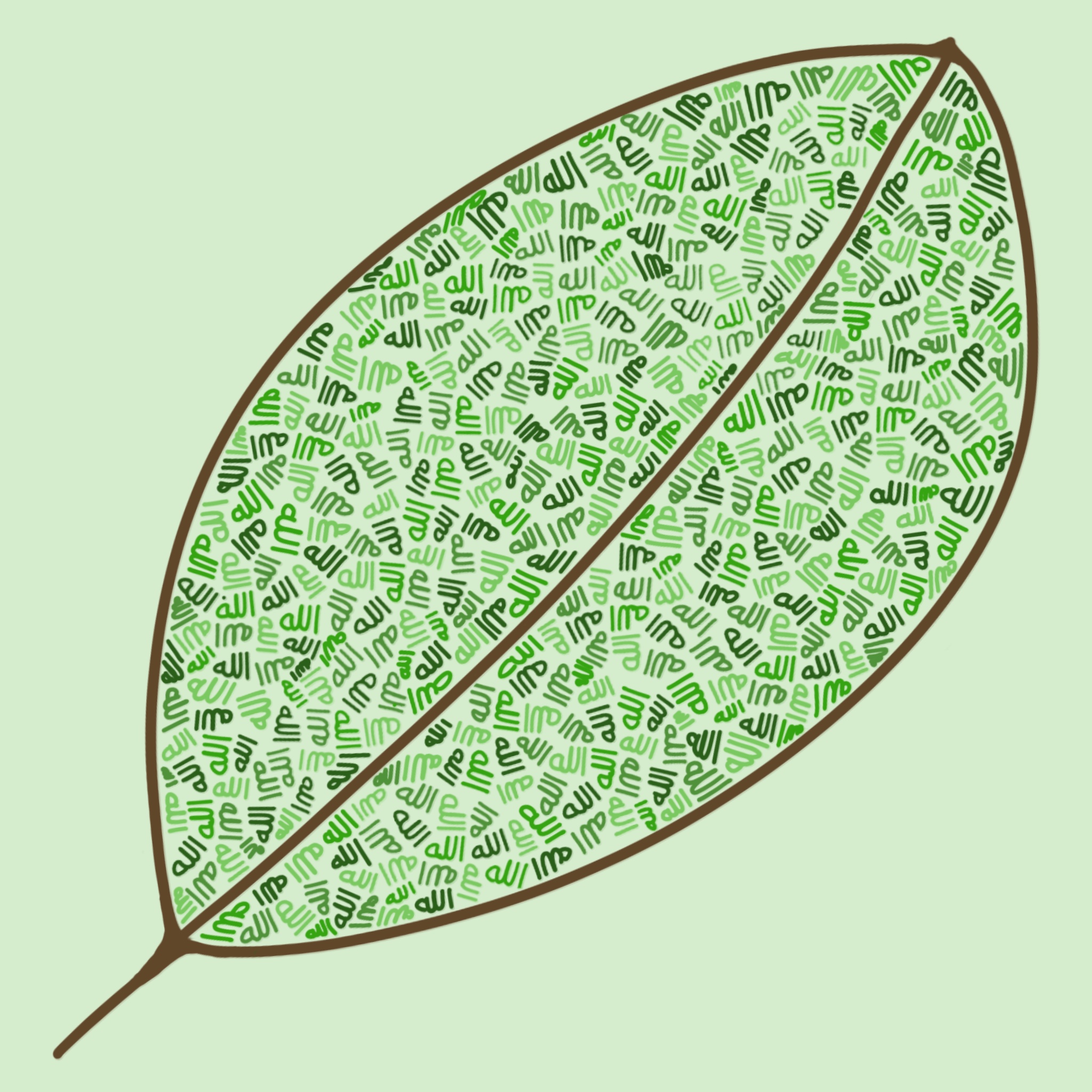 My design is a digital illustration of a single leaf, populated by an arrangement of hundreds of miniature Allah scripts. The design reflects the notion that Allah is found everywhere by demonstrating the apparent presence of Allah in even the smallest segments of a single leaf from the natural world. The design also represents the role of Allah as the creator of nature. On the aesthetic level, the varying color palette and random arrangement of the scripts attempts to convey the beauty, majesty, and complexity of Allah’s creations. The design intentionally challenges observers to focus in and discover the presence of Allah in unexpected locations. Thus, it also seeks to demonstrate the role of Allah as a confounder—and the duty of Muslims to seek him out in themselves and in the world around them.