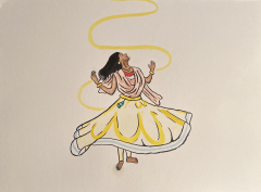 In my calligram project, I painted a woman participating in the whirling who has successfully transcended the abyss that separates the human from the divine. Prior to her whirling, she was in a state of the Shariah (the “outer”), present only in the physical world. Through whirling, her method of Tariqah (the “path”), she was able to ascend to a state of Haqiqah (“the real”), represented by the transcendent yellow light inspired by the Light verse from the Quran, and the appearance of Allah on her dress. Although Allah was not visible in the Zahir (“the physical”), once the woman became one with the divine, the Batin (“the hidden”) revealed itself through the calligraphy of Allah on her dress. Through this spiritual practice, the woman was able to liberate herself from the separation from Allah and establish a conscious relationship with the divine.