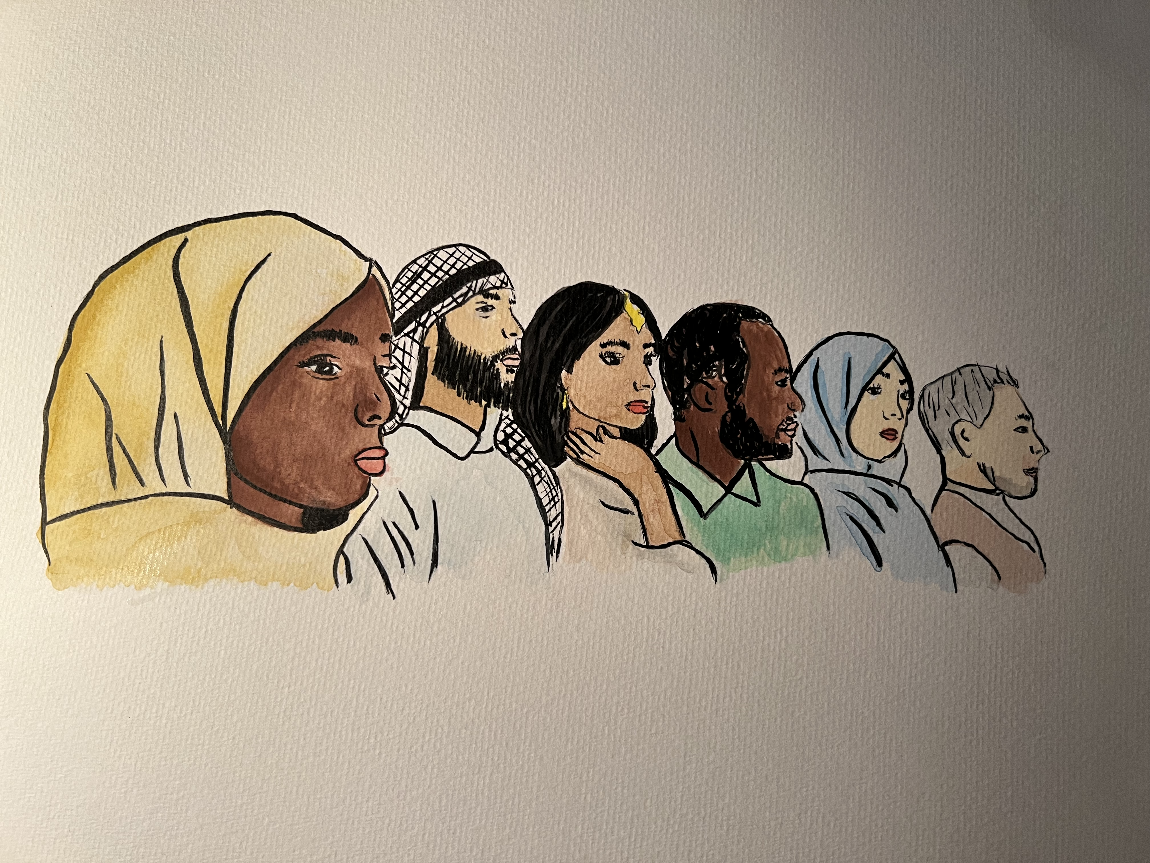 To celebrate this diversity within Islam, I have painted six Muslims with diverse backgrounds, all gazing in the same direction. These Muslims have distinct clothing, skin tones, and ethnic features representing the multitude of practicing Muslims across the world. Some may choose to uphold the common “Muslim” appearance, such as wearing the hijab, while others choose to wear other items of clothing. Clothing also signifies the rich cultural diversity within Islam as regional customs and traditions often influence clothing. For example, the South Asian woman in my painting is wearing South Asian jewelry while the Arab man is wearing the kaffiyeh, which is often associated with Arab culture. Likewise, the varying skin tones within the people in my painting reflect the many races and ethnicities that make up the global Muslim community. I painted the six Muslims standing in unison and gazing in the same direction, symbolizing the shared spiritual journey that Muslims undertake. While each individual may have unique interpretations and experiences of the faith, a sense of unity connects Muslims worldwide.