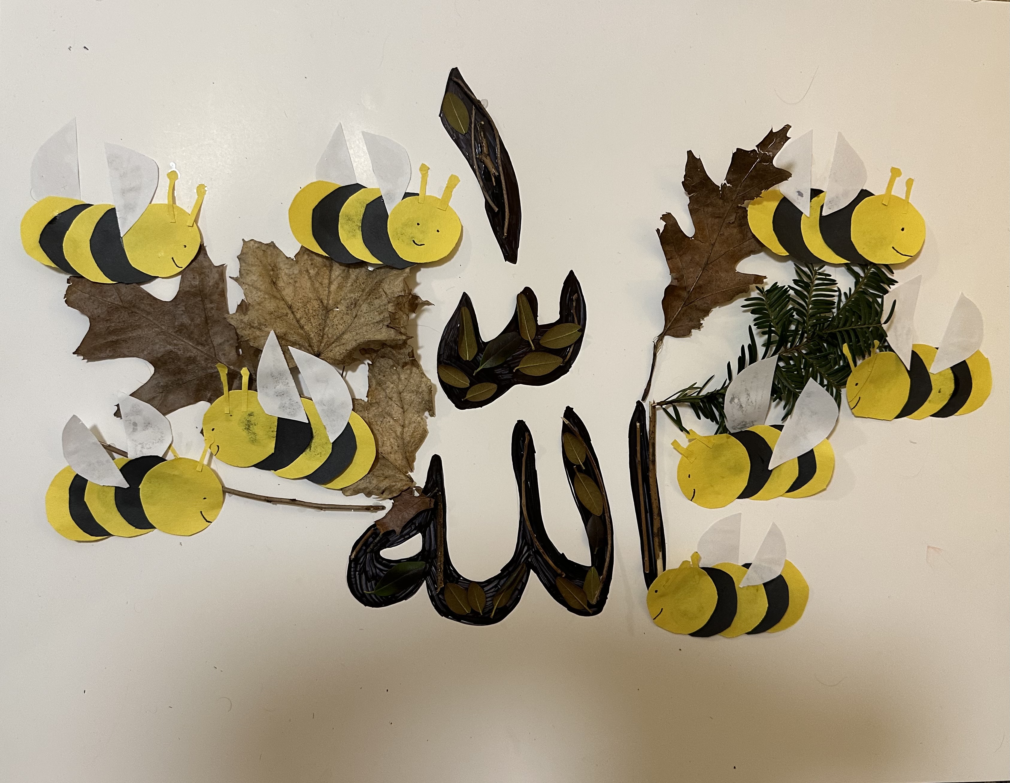 12023-02-22T00:05:09-05:00Michael Pecorara5Salaam Alaykom wa Bismillah al Rahman al Raheem My calligram is inspired by Quranic verse 16:68 which states, “And your Lord inspired to the bee, “Take for yourself among the mountains, houses, and among the trees and [in] that which they construct”. The idea that everything from the leaves on trees to a simple bee all have the potential to submit to God seemed really comprehensive to me and made me think of Islam and submission to God as a universal and communal act. I made sure to include 8 bees at the behest of my Muslim roommates who explained that the number 8 had a special meaning in Islam as it is the number of angels carrying the throne of Allah in heaven as well as the number of gates in heaven. I thought that this numerology would give a divine quality to my work. I was also really inspired by the quote from the Persian poet Saadi who states, “Every leaf of the tree becomes a page of the sacred scripture once the soul has learnt to read.” The idea that even the twigs of Quincy courtyard could have meaning derived from them once someone truly has understood the Quran makes the power of Islam and comprehension of the Quran seem limitless. The bees are made of construction paper and the Arabic writing itself is interspersed with leaves and twigs that I found in Quincy courtyard. I made this calligram communally with two of my Muslim roommates and my girlfriend and it was a great way for me to learn more about the Quran and experience Islam. Thank you for this opportunity.plain2023-02-22T00:15:05-05:0042.370883333333,-71.116516666667