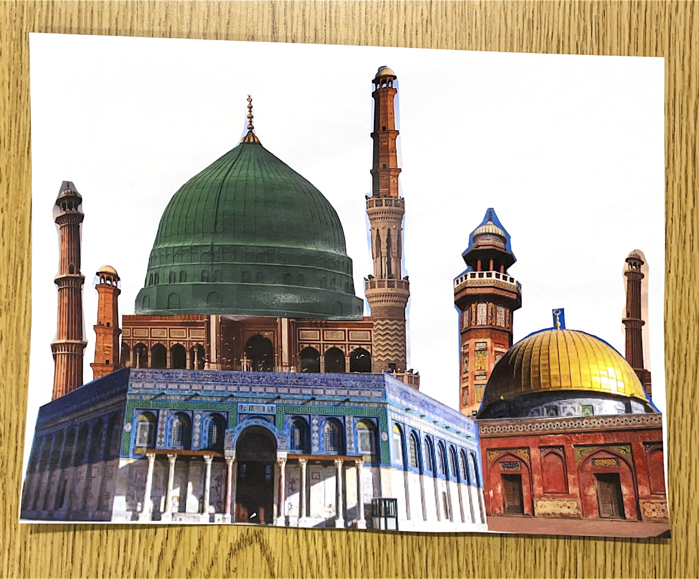My intended audience is westerners who view Islam as one monolithic identity that is independent of culture. The reason for this is because when someone pictures a mosque, they may only be thinking of the Masjid al Aqsa, which has taken the news recently because of the violent attacks, or the Kaaba. However this piece combines mosques from Lahore Pakistan, Al Madinah Saudi Arabia, Delhi India, Xi'an China and Palestine. I want my audience to understand that Islam is a religion that evolves depending on the context it is found in, however all Muslims still believe in their submission to god and worship Allah (SWT) in their own way as demonstrated by the culturally rich array of architecture in this collage.