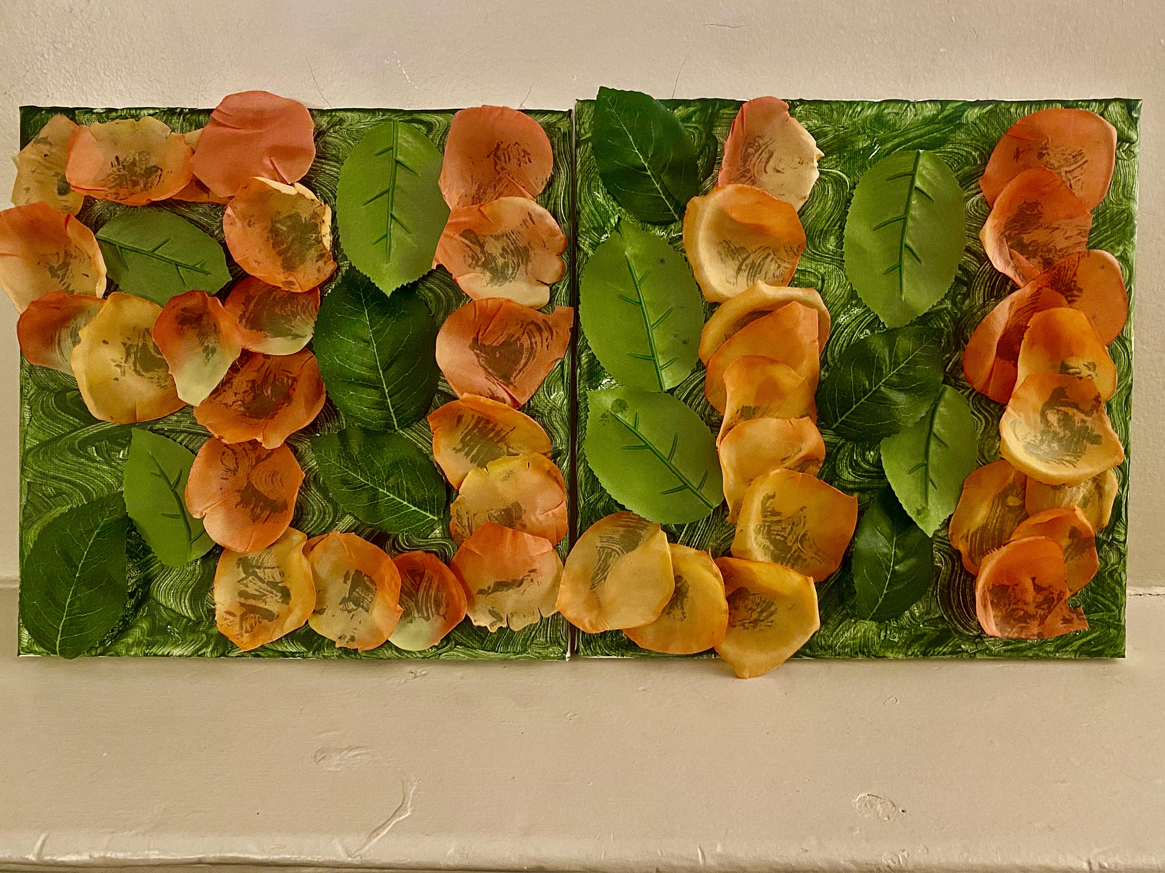 Orange flower petals were used to write the word Allah in Arabic while the green leaves from the stem were used to decorate the surrounding canvas. The backdrop of the canvas is a dark green that I painted on the canvas using a waving motion with the brush to replicate the look of a grass field filled with the natural randomness. Each blade of grass is wavy and randomly drawn to create a more natural feel to the artwork. The orange flower petals provide contrast to the surrounding greenery to make the beauty of the word Allah stand out from the rest of nature. Originally, the artwork was only meant to be on 10 inch by 10 inch canvas, however I opted for two canvases side by side (20 inches by 10 inches) in order to stretch out the word Allah.