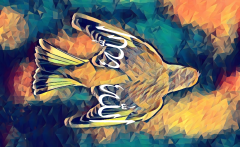 In creating this image, I used photoshop to make an abstract and colorful drawing of an image of a small bird I found online. For the colors, I chose a blend of orange and teal, colors on opposite ends of the color wheel, signifying Allah's beauty and presence everywhere one looks. I then photoshopped the calligraphy to appear as though the letters made up the bird's wing feathers, as Allah is not separate but entwined in everything we perceive.