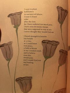 This poem is from the collection All Along You Were Blooming by Morgan Harper Nichols. I’m especially drawn to the opening lines: “I want to plant bellflowers in unexpected places.” This phrase became a personal touchstone and mantra for me as I navigated the loss of my mother to drug addiction. In the wake of such grief, the image of planting something delicate and beautiful in unlikely soil resonated deeply. It offered me the hope that beauty can be found within brokenness and that laments could one day be turned into love songs. To me, these words beautifully express the quiet, persistent choice to be tethered to hope, even in the midst of despair. I deeply believe that, however unlikely it may seem, loss and suffering can shape us into more tender, compassionate human beings—people who still believe that something living can emerge from grief and people who choose to plant bellflowers when and where they are least expected. It’s a powerful metaphor for our capacity to find silver linings and to trust that healing and growth are possible even when unexpected.