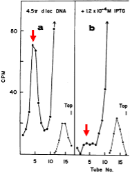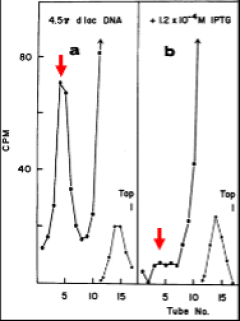 Radioactive repressor was sedimented through a glycerol gradient in the presence of lac-containing DNA. As seen in panel a (left), radioactivity sedimented at a position corresponding to tubes 4 and 5 as highlighted with the red arrow. Panel b (right) shows that little radioactivity sedimented at this position when centrifugation was carried out in the presence of IPTG. Evidently, then, repressor binds to lac DNA and this binding is prevented by the presence of inducer. Moreover, an additional experiment showed that binding to lac DNA was specific as no binding was observed with DNA not containing lac DNA.