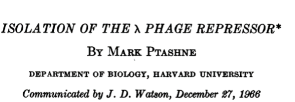 All this was carried out in hot competition with a second investigator in the Biological Laboratories, Mark Ptashne. Ptashne, who was born in 1940, earned his PhD in 1968 with Matt Meselson in the Harvard Biological Laboratories. He was appointed a Junior Fellow of the Harvard Society of Fellows (1965-1968) after which he became a Lecturer and was promptly promoted to Professor in 1971. Ptashne is known for the first demonstration of specific binding between a protein (λ repressor) and DNA. His book, A Genetic Switch, on the regulatory circuit governing the switch between the prophage and lytic growth states of λ is a classic in the field of gene control. Ptashne went on to study gene control in yeast. He founded (like Gilbert) one of the first biotech companies, The Genetics Institute, in 1980. He won the Lasker Award in 1997. Ptashne is also a violinist who would perform at meetings at the Cold Spring Harbor Laboratory. He eventually left Harvard and is now at the Memorial Sloan-Kettering Cancer Institute.