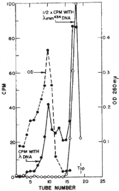 Ptashne isolated the phage λ repressor by comparing the radioactive profile of a mixture of H3-labeled protein from cells infected with wildtype phage and C14-labeled protein from cells infected with λ mutant for the phage repressor gene (C1). Chromatography revealed a protein that was uniquely labeled with H3. The Ptashne paper was published a few months after that of Gilbert and Műller-Hill. But since the Ptashne isolation of repressor was based on radioactive labeling of the protein, he was immediately prepared to ask whether repressor acts by binding to DNA. Accordingly, he subjected radioactive repressor to sedimentation through a sucrose gradient in the presence of phage λ DNA and DNA from a closely related λ phage (λ434) that is not subject to repression by the λ repressor. (λ434 has its own repressor and operator and is said to have a different “immunity” than that of λ.) The striking result (figure to the left) was that radioactive λ repressor exhibited a fast-sedimenting peak (tube 10; solid line with filled circles) when the experiment was carried out with λ DNA but not when it was carried out with λ434 DNA (tubes near the top; solid line with open circles).
